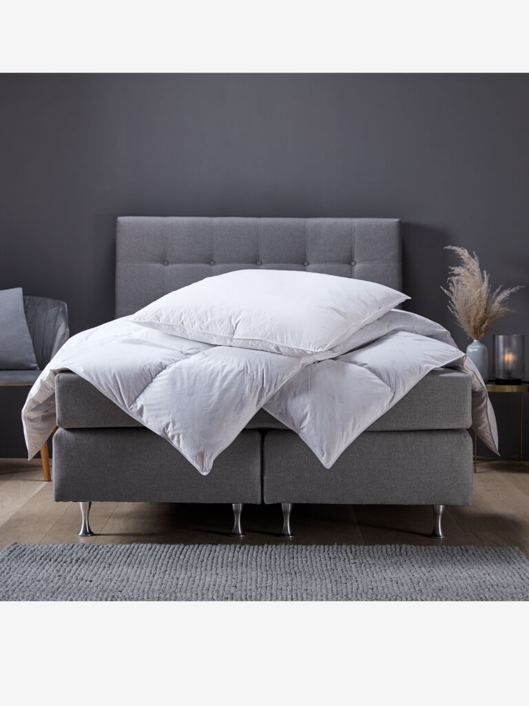 Couette anti-allergie en duvet de canard 155x220 cm avec 90 % de duvet de canard / 10 % de plumes de canard, 1100 g. Enveloppe douce en chambray 100 % coton. L'enveloppe à tissage serré aide à réduire la pénétration des acariens. Construction à carrés cousus pour assurer une répartition uniforme du garnissage. Pouvoir de remplissage 550. Lavable à 60 °C. Incl. sac de rangement.