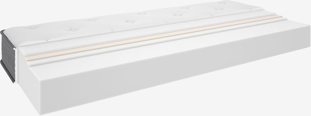 | Matelassage | 350 g/m² fibre polyester + 10 mm latex + 15 mm mousse polyéther 20 kg/m³ // 350 g/m² fibre polyester + 10 mm mousse à mémoire de forme 42 kg/m² + 15 mm mousse polyéther 20 kg/m² |