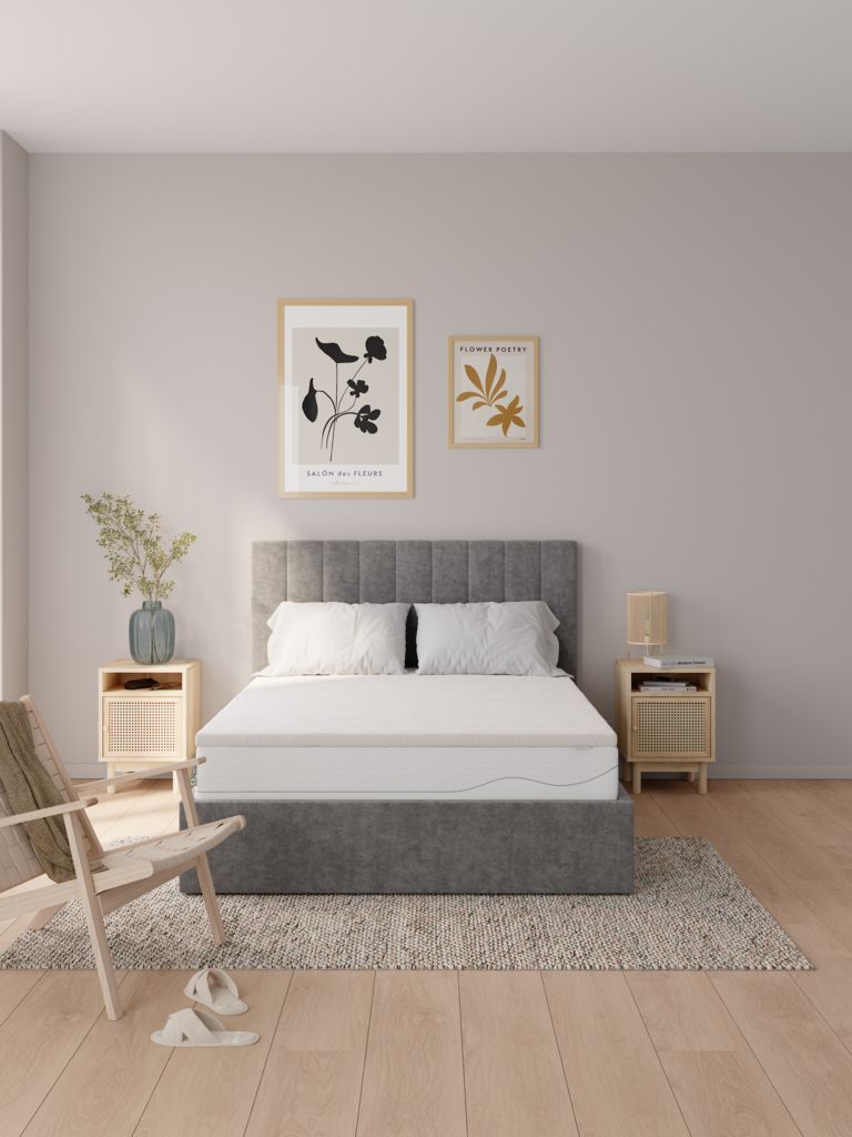 Surmatelas de 4 cm de profondeur 140x190 cm avec un noyau en mousse de polyéther. Housse lavable en microfibre douce 100% polyester (100% recyclé) avec un matelassage léger.