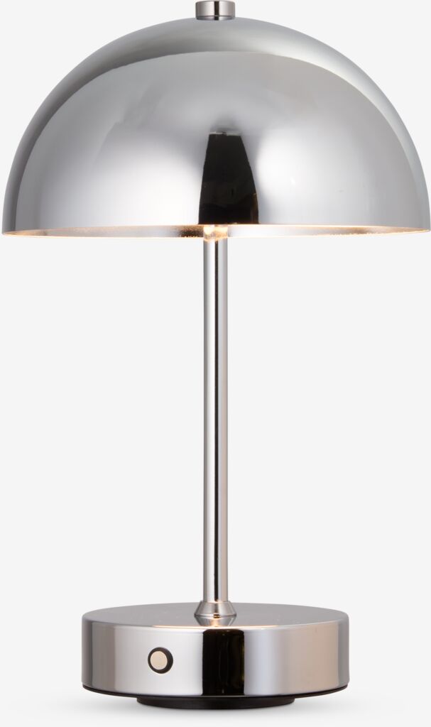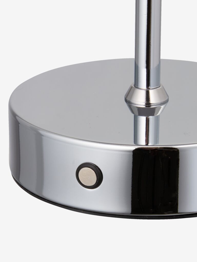 En chrome. Avec commande tactile, 3 niveaux de luminosité et minuterie. Excl. piles. Ø16 x H25 cm