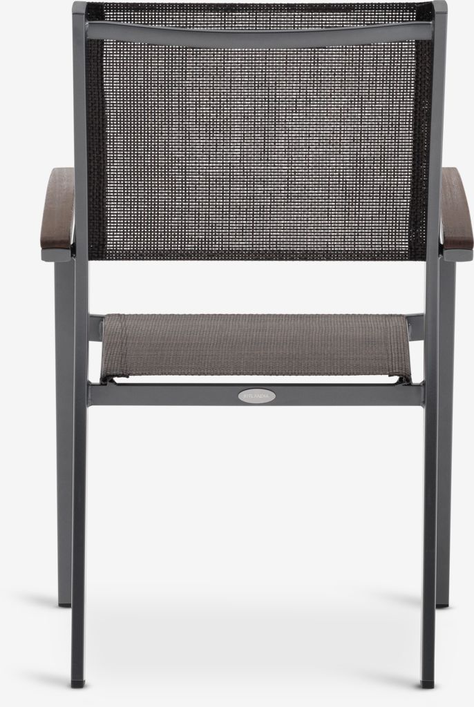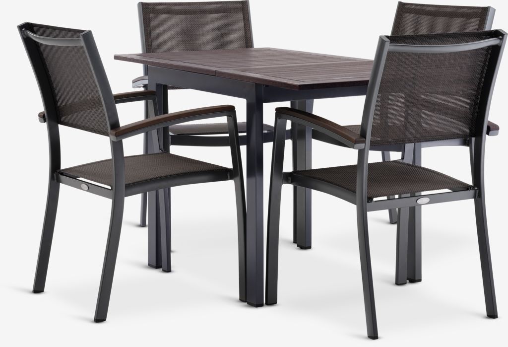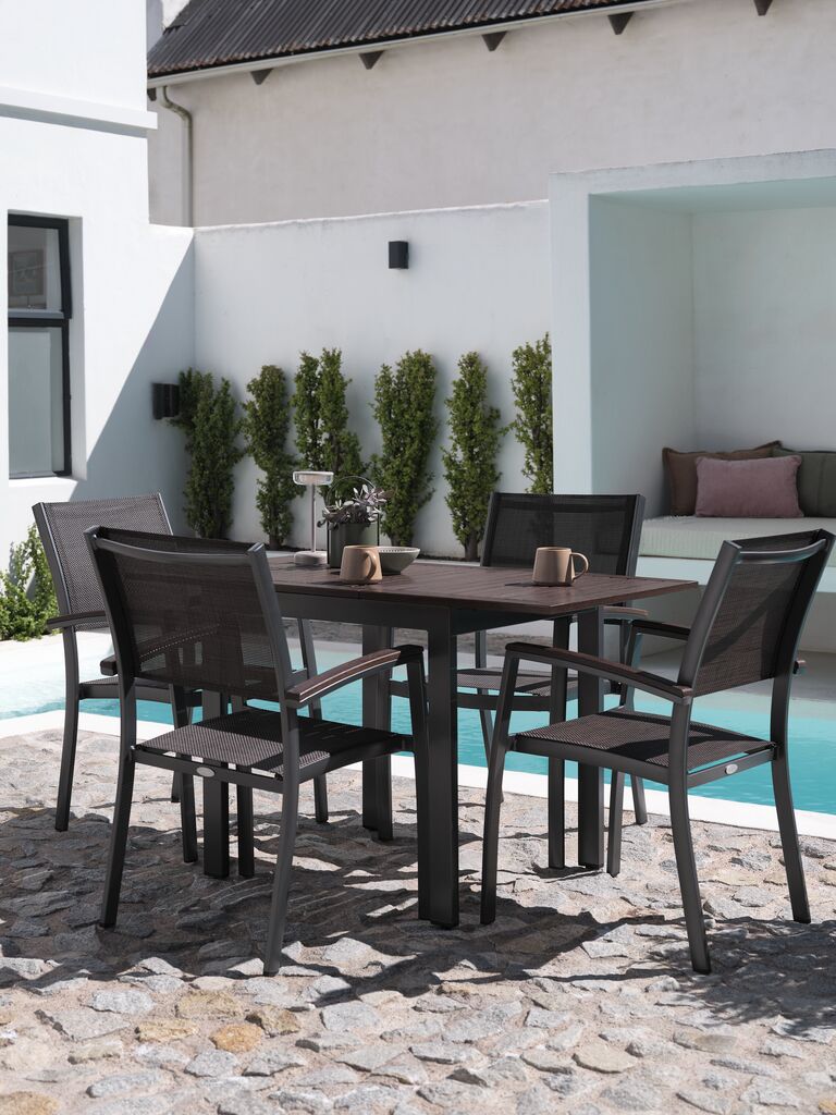 Ensemble de meubles de jardin 4 places. Table : Aluminium et bois dur FSC® huilé. Avec 1 rallonge. l70 x L75/126 x H75 cm. Chaise : Aluminium, textiline et bois massif FSC® huilé. Empilable.