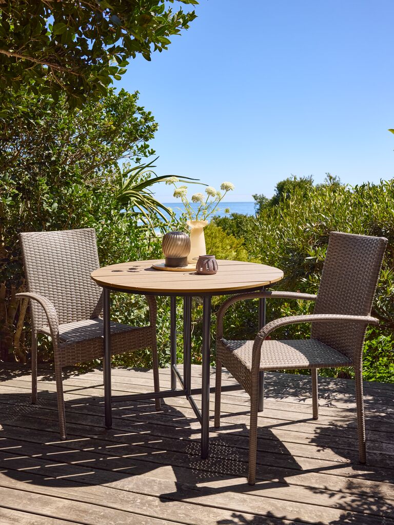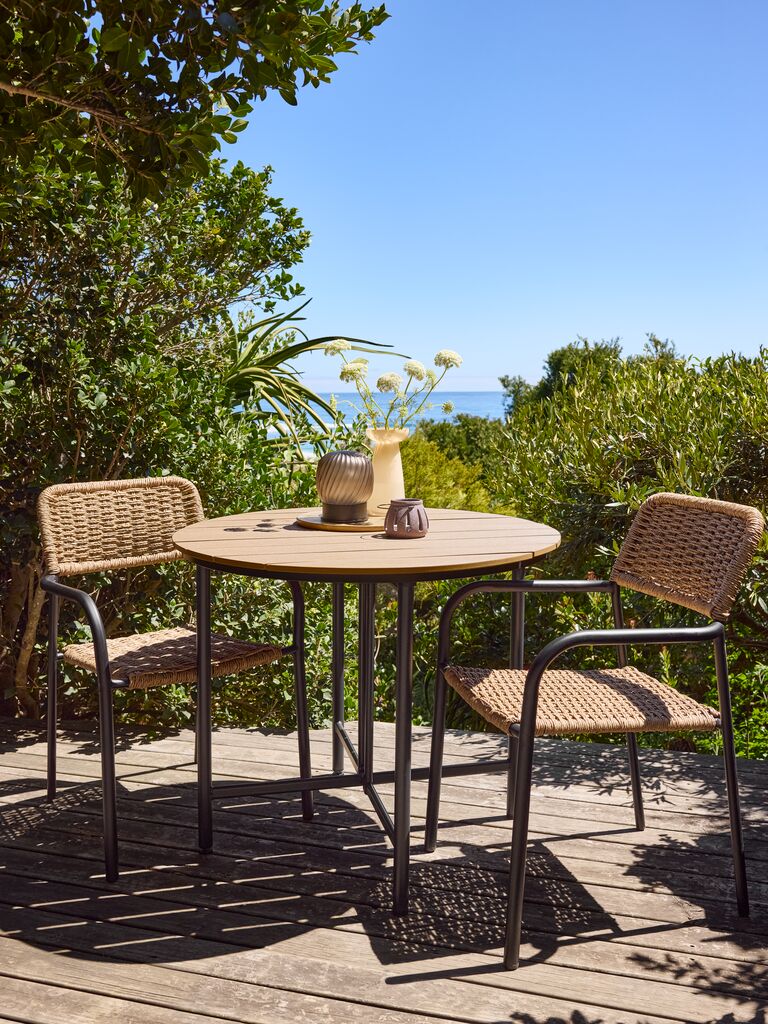 Table de jardin ronde avec un plateau en imitation bois. Le cadre noir et les pieds sont en acier peint par poudrage. L'imitation bois a l'apparence et la texture du bois naturel sans nécessiter d'entretien. La table dispose de deux abattants, ce qui permet de la replier entièrement ou partiellement. l90 x L18/54/90 x H74 cm