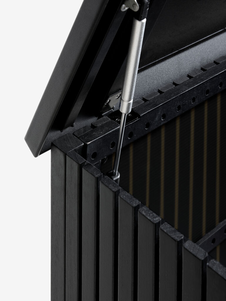 Coffre à coussins en bois FSC® vernis et acier galvanisé. Avec couvercle hydraulique facile à utiliser. l133 x H61 x P54 cm