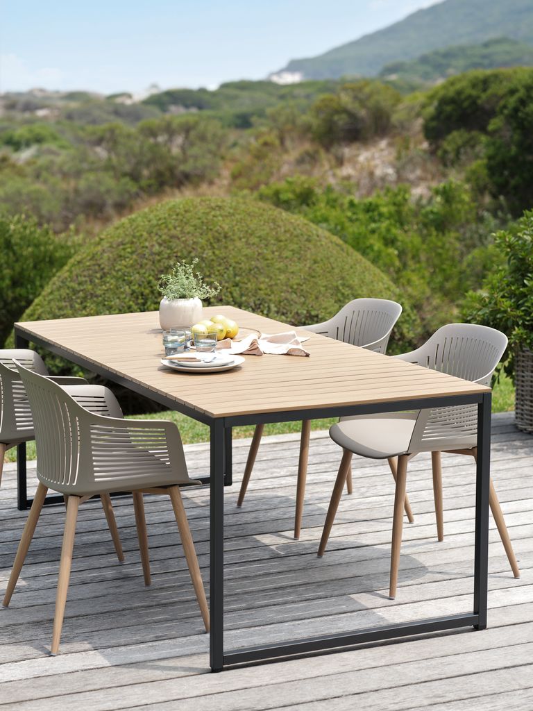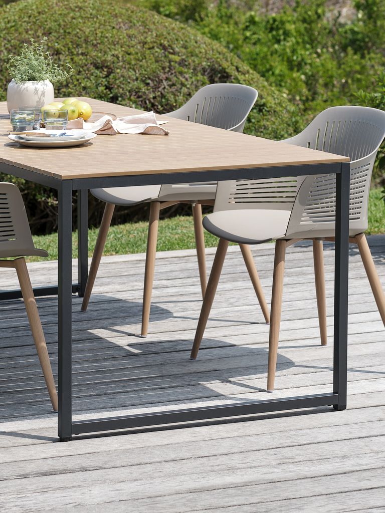 Table de jardin avec un plateau en imitation bois. Cadre noir en aluminium et pieds assortis en acier galvanisé peint par poudrage. L'imitation a l'apparence et la texture du bois naturel sans nécessiter d'entretien. L'aluminium est un matériau léger et robuste qui ne rouille pas. L'acier est galvanisé afin d'aider à le protéger contre l'usure et la rouille. l90 x L190 x H74 cm