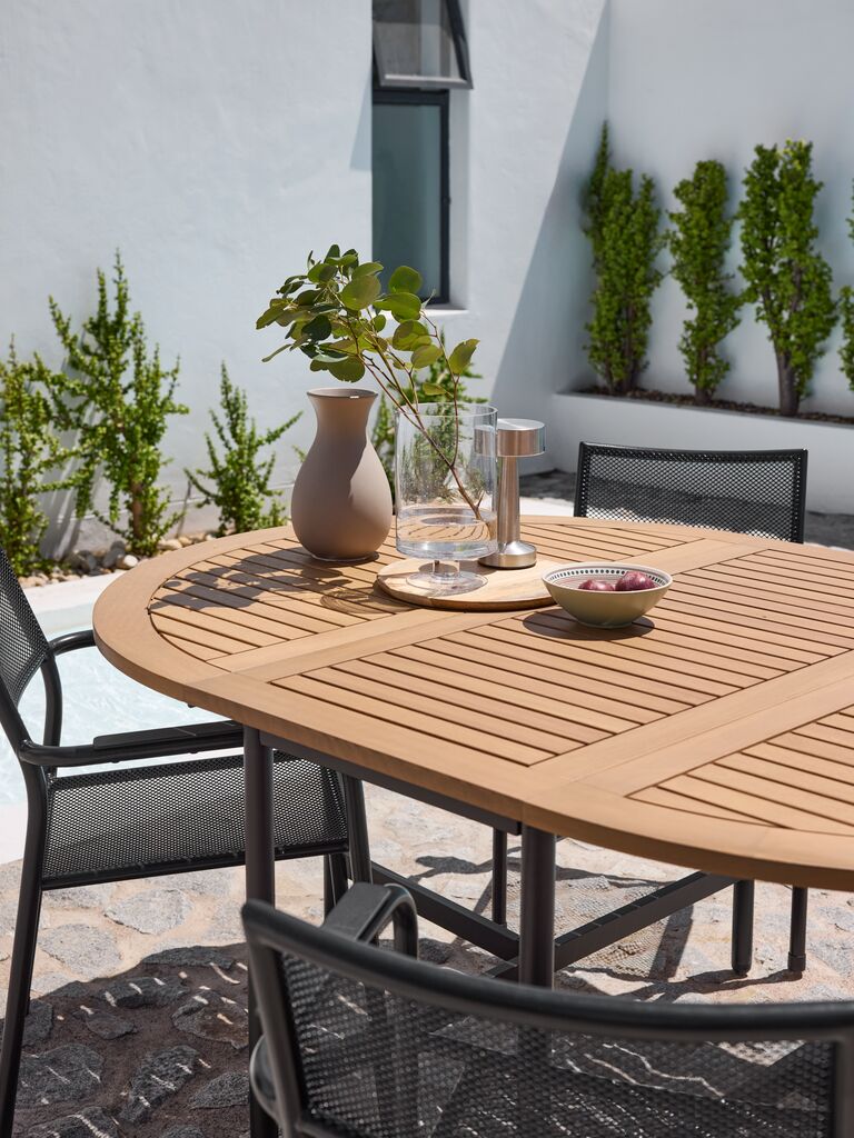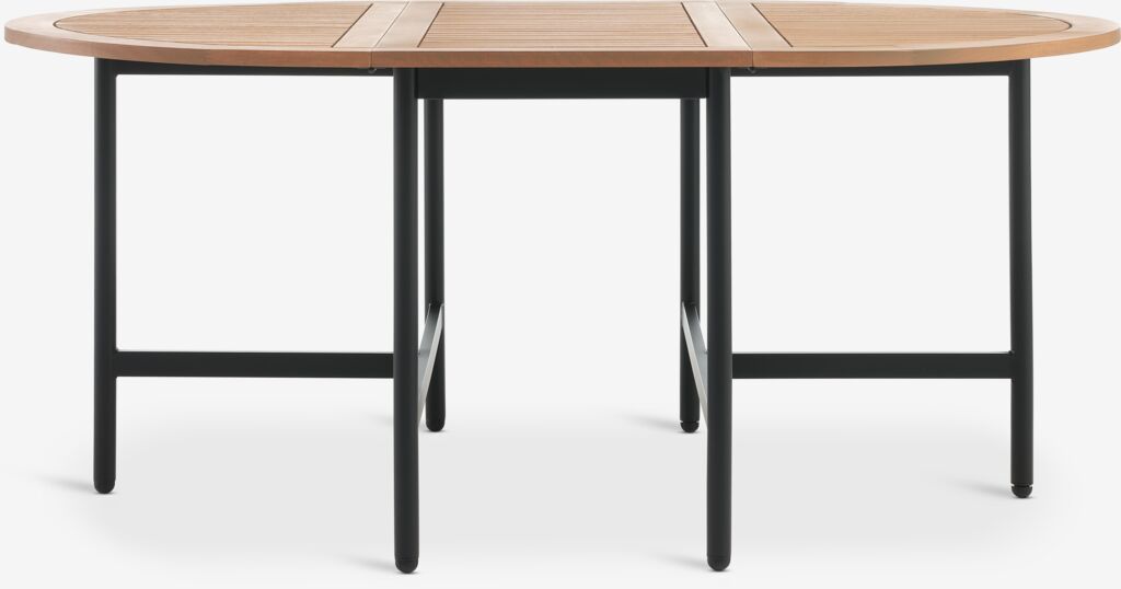 Table de jardin avec plateau en bois massif laqué FSC®. Structure et pieds en aluminium thermolaqué noir. La table est équipée de deux abattants, permettant de la replier entièrement ou partiellement. Le bois est laqué pour une durabilité accrue. l121 x L59/117/175 x H75 cm