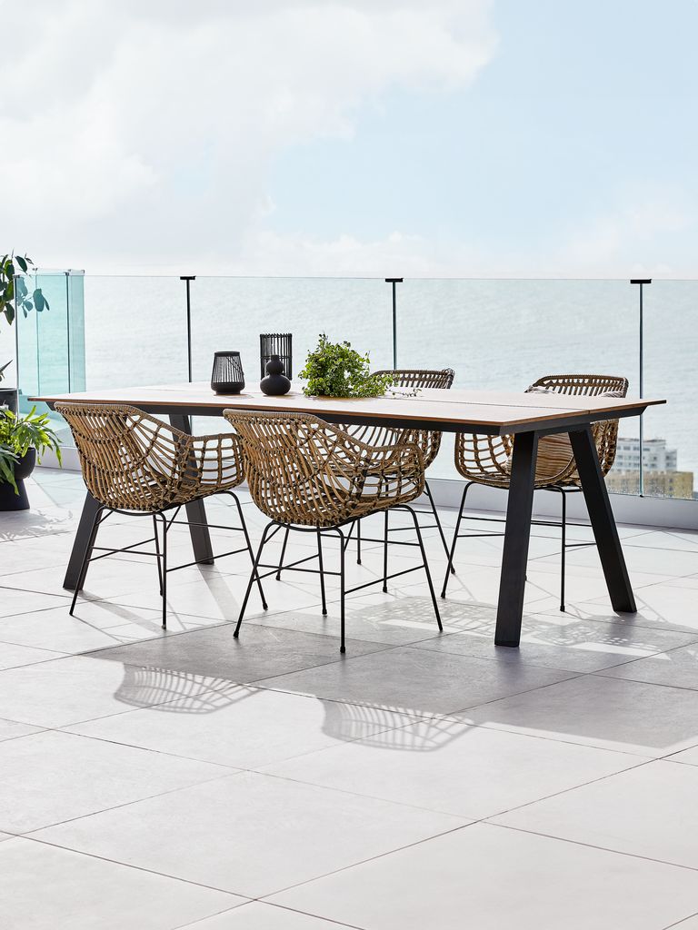 Ensemble de meubles de jardin 4 personnes. Table : aluminium et imitation bois. l100 x L220 x H74 cm. Chaise : acier et polyrotin.