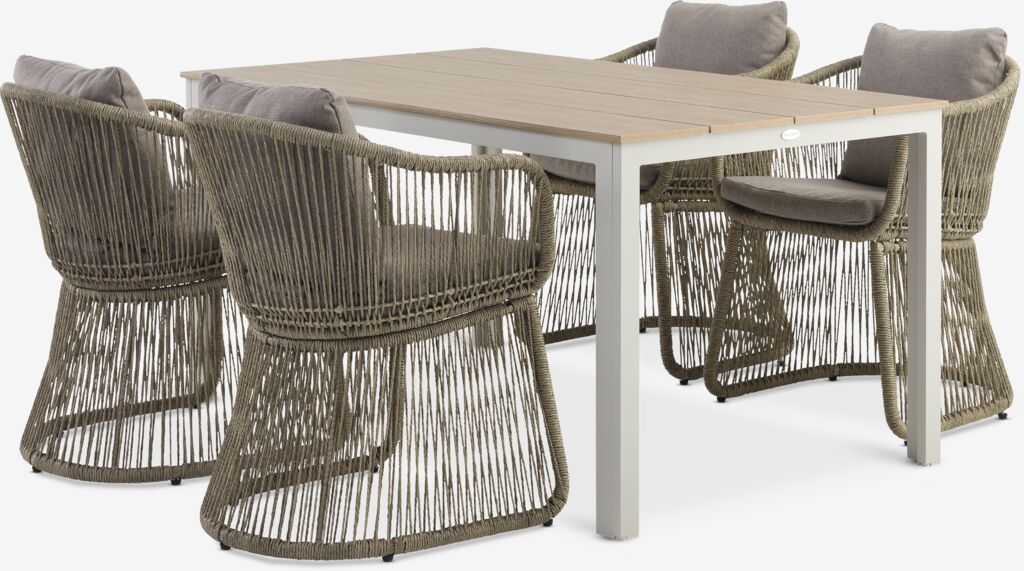 Ensemble de jardin 4 places. Table : aluminium et bois composite. l90 x L150 x H74 cm. Chaise : acier et corde en polyéthylène. Coussins de luxe inclus, avec housse résistante en tissu structuré.